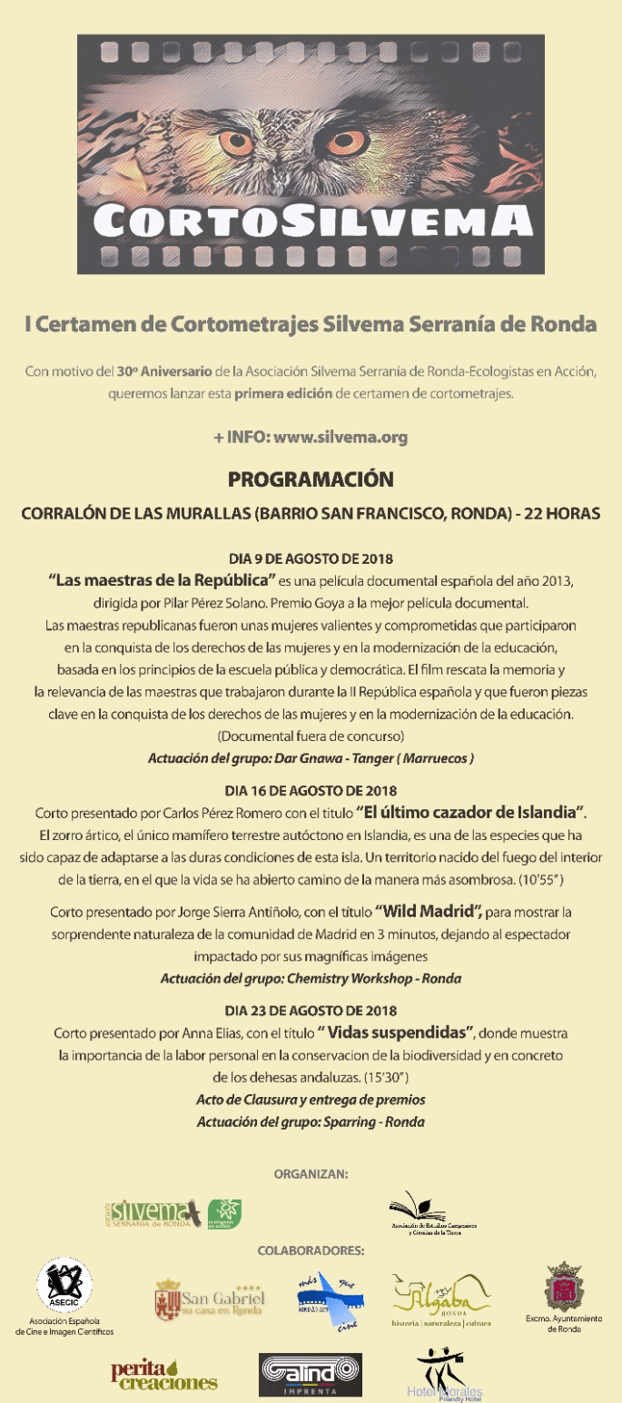 Os presentamos el programa de actos que se va a celebrar durante algunos jueves del mes de agosto con motivo del I Certamen de Cortometrajes con temática ambiental y agroecologica que organiza Silvema Serranía de Ronda-Ecologistas en Acción y la Asociación de Estudios Campesinos y Ciencias de la Tierra, junto con varias entidades y empresa locales que han colaborado. Se celebrará en Ronda en el Corralón de las Murallas en el Barrio de San Francisco. Esperamos que todas estas actividades sean de vuestro interés y así contribuir a un planeta más justo, conservar y defender nuestra naturaleza más cercana. Os esperamos.
